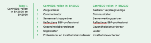 Net als in Bachelor Nursing 2020 (BN2020) is ervoor gekozen om met de CanMEDS-rollen te werken. Dit sluit aan bij de internationale en nationale trend bij de ontwikkeling van beroeps- en opleidingsprofielen voor gezondheidszorgberoepen. Wel is de rolbenaming van Zorgverlener aangepast naar Bachelor verpleegkundige, die van Organisator naar Leider, en die van Professional en kwaliteitsbevorderaar naar Kwaliteitsbevorderaar. De overige rollen hebben hun naam behouden. Zie tabel 1.